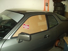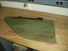 I rather liked having windows, due to the fact that I drive the car to and from events (for the time being anyway). The solution came in the form of 1/4" thick plexiglass sourced online for $30 shipped for enough to do both sides. I traced the stock glass onto the paper backer of the plexi and my brother so kindly cut them out for me. With the rough edges filed down, it fit pretty damn well. I did have to use an air sander to trim a few high bits, but that was my fault by drawing the lines like a drunk.