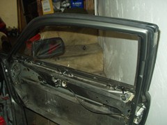 With the door panels off, windows and related BS removed, I began feverishly cutting. Then bending. Then cutting some more. Then bending. Then drinking a beer and inspecting the burn marks from flying molten metal. Then finally muscling the damn section out.